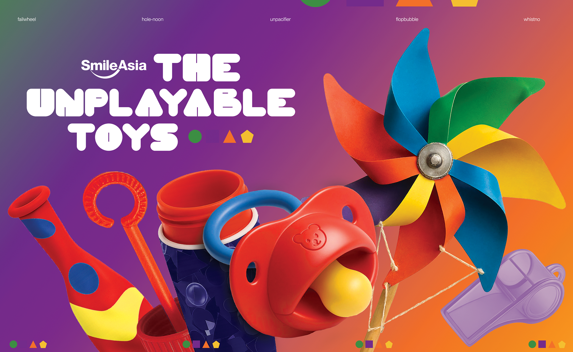 Cada um dos brinquedos foi reimaginado com base nas condições das crianças com lábio leporino, tornando todos inutilizáveis. Os nomes e taglines de cada um traduzem esses pontos.