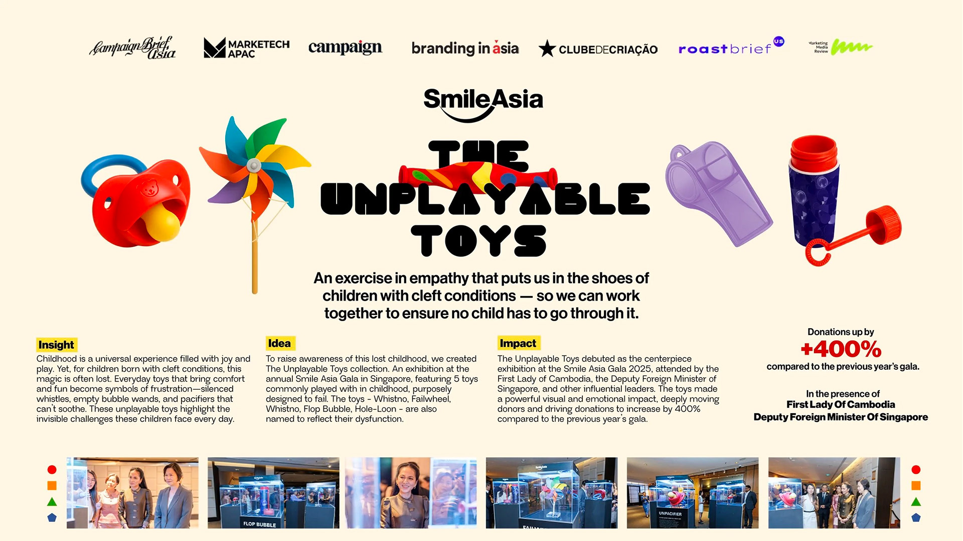 Cada um dos brinquedos contava com um conceito e uma descrição explicando a inspiração por trás do seu design, incentivando o público a pensar sobre a infância das crianças com lábio leporino.